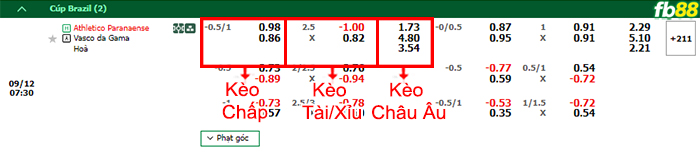 Kèo chấp được ấn định cả trận là 0.5/1. Trong đó, Atletico Paranaense vs Vasco da Gama nhận mức cược ăn lần lượt là 0.98 và 0.86 cả trận.