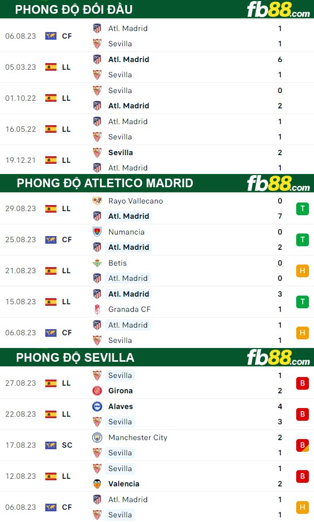 Phong độ thi đấu gần đây Atletico Madrid vs Sevilla