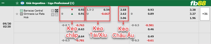 Kèo chấp được ấn định cả trận là 0. Trong đó, Barracas Central vs Gimnasia nhận mức cược ăn lần lượt là 0.93 và 0.91 cả trận.