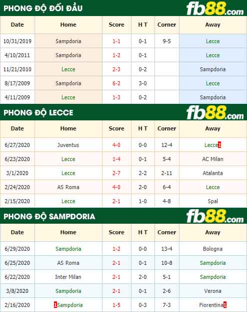 Trận đối đầu hấp dẫn giữa hai đội Lecce vs Sampdoria sắp tới đang thu hút sự chú ý của rất nhiều người hâm mộ. Cả hai đội đều đang đặt quyết tâm cao có chiến thắng trong trận đấu này. Với quyết tâm của mình cùng với phong độ tốt thì Sampdoria đang rất tự tin mang về chiến thắng trong màn tranh tài này. Diễn biến cuộc đọ sức hấp dẫn và cá độ đẳng cấp tại nhà cái uy tín FB88.