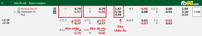 Tỷ lệ kèo Châu Âu Nhà cái đưa ra mức kèo cược Mumbai City thắng tỷ lệ ăn 1.47, Chennaiyin thắng tỷ lệ ăn 5.50, hòa toàn trận 4.44.