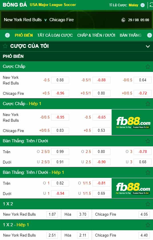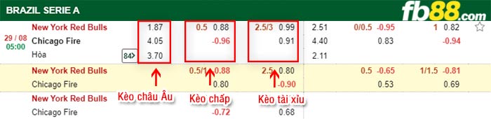 Kèo chấp được ấn định cả trận là 0.5. Trong đó, New York Red Bulls vs Chicago Fire nhận mức cược ăn lần lượt là 0.88 và -0.96 cả trận.