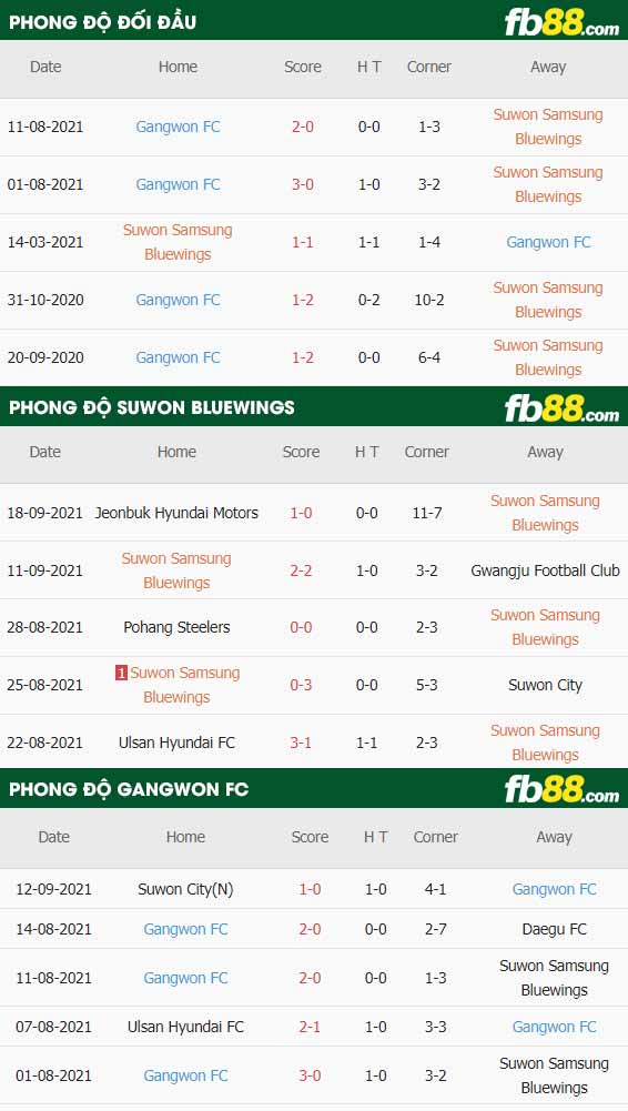 Phong độ thi đấu gần đây Suwon Bluewings vs Gangwon FC