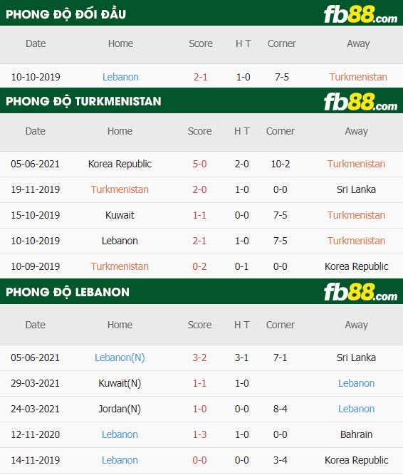 Phong độ đối đầu Turkmenistan vs Lebanon