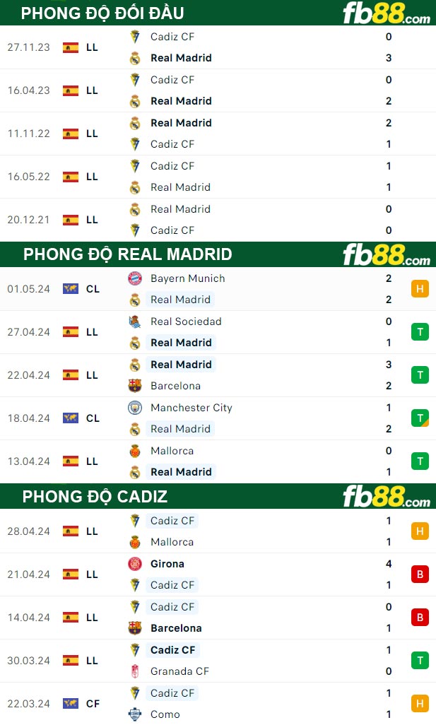 Phong độ thi đấu gần đây Real Madrid vs Cadiz