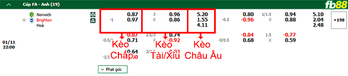 Nhà cái FB88 ấn định mức kèo chấp cả trận là 1.0. Trong đó, Norwich vs Brighton lần lượt nhận mức cược ăn là 0.87 và 0.97 cả trận.