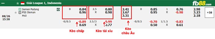 Tỷ lệ kèo Nhà cái Châu Âu đưa ra mức kèo cược Semen Padang thắng tỷ lệ ăn 2.41, PSS Sleman thắng tỷ lệ ăn 2.67, hòa toàn trận 3.31.