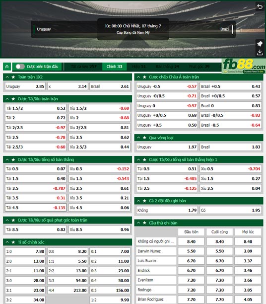 Nhà cái FB88 ấn định mức kèo chấp cả trận là đồng banh. Trong đó, Uruguay vs Brazil lần lượt nhận mức cược ăn là -0.97 và 0.83 cả trận.